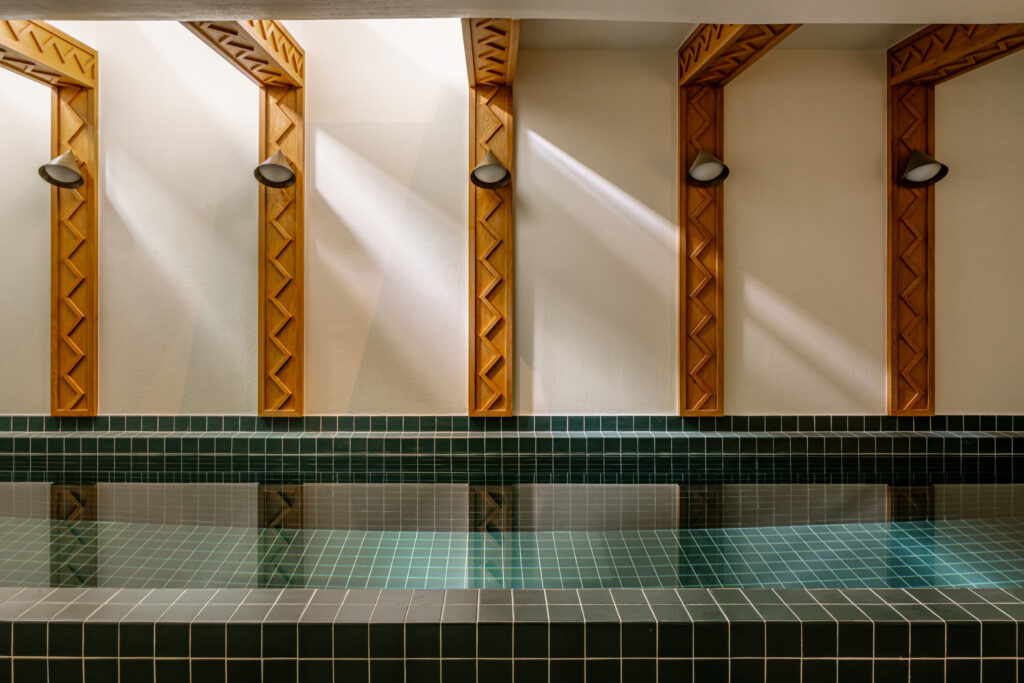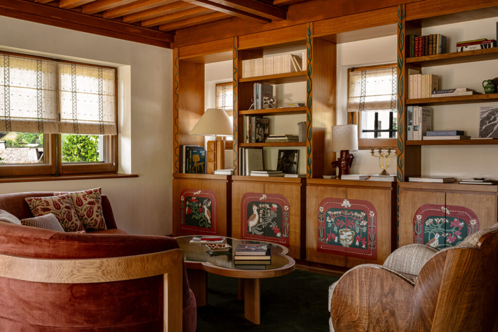 Parmi elles, la bibliothèque du Salon aux motifs peints par Louise Defente, une fresque murale de Héloïse Rival dans une salle de bain, une sculpture en bois d’Eloi Schultz dans le couloir-musée “Henry Jacques Le Même” ou encore une installation de Côme Clérino au dessus de la piscine intérieure témoignent de ce dialogue entre patrimoine et création contemporaine.